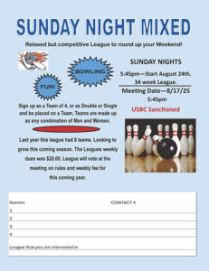 Sunday Night Mixed Sunday Nights @ 5:45 pm 14 Weeks Starting August 24 For Questions or Signups jbatchelder@yankeelanesentertainment.com View Poster